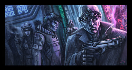 Still one of my favorite pics. I love the character design, the dynamics, the casual use of ads in the background, the lighting. Absolutely stunning.