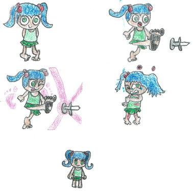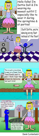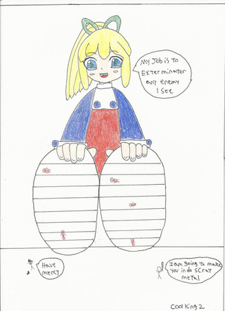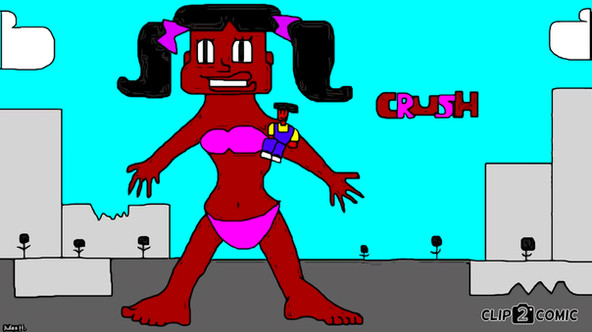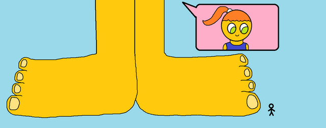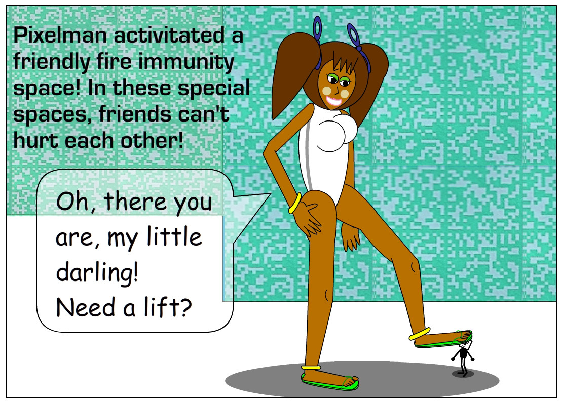 Patrick Pixelman activates a friendly fire immunity space by toggling a special switch that only he can use. In these special spaces, friends can't hurt each other! So when his large girlfriend Lady Fingersandtoes steps on him, he remains unharmed, thanks to the magic of the F.F.I.S.! She caresses him, smushes him, then gives him a lift with her prehensile foot!