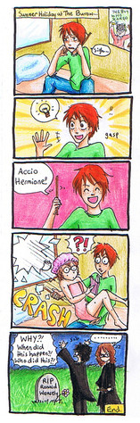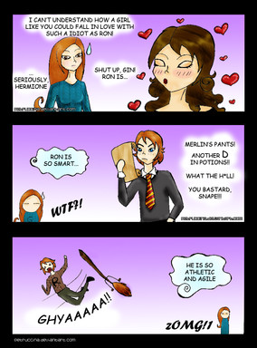 Well I really felt sorry for Hermione in the 4th book when Ron said "Hey Hermione! You are a girl!". I thought, oh my gosh, how stupid could Harry and Ron be? Then when they saw her at the Yule Ball, their jaws dropped open and it finally hit them that Hermione is not a boy, she's a girl. So I drew this for fun, that since first year after the troll incident Harry and Ron let Hermione hang out with them as one of the boys, and then in second part, after all those years of hiding her girlish figure under a cloak, Harry and Ron surprisingly see that she grew curves. Hope you like it!Related content