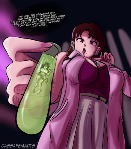 CommandThrower asked for a shot of the Dr discovering a tiny Xarla in her office. Since I barely ever do perspective work of any kind, this was a challenge! But I'm pretty happy with how it turned out!More Dr: