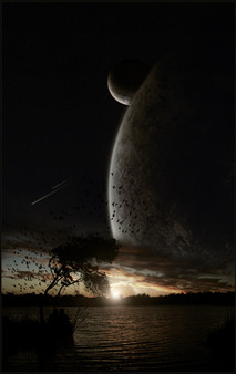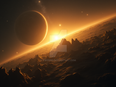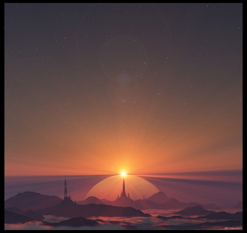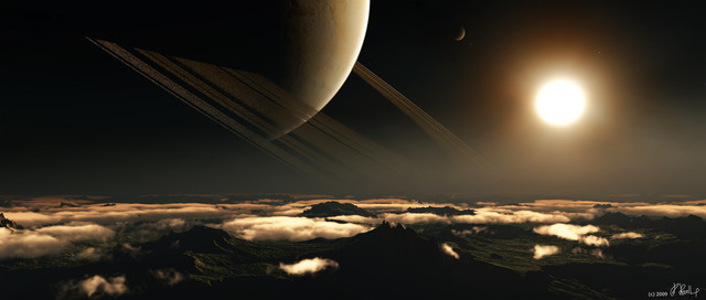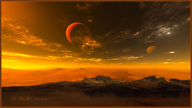 I love the foggy terrain!! The planets are neat, too. Really gives the sense of size. Also like the flare/glow. :} Excellent job indeed!