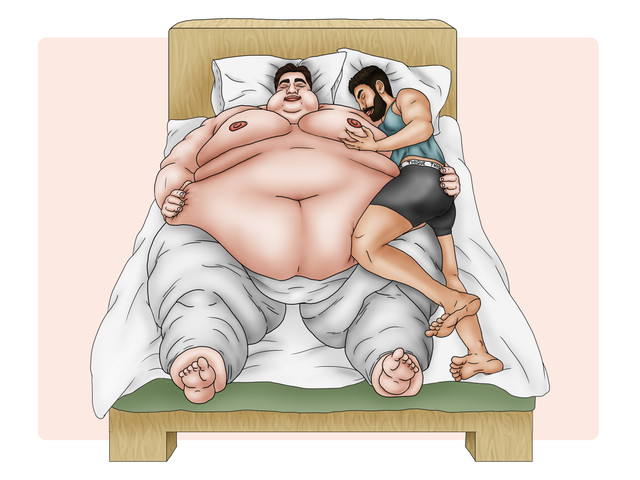 A big and hungry man trying to wake up his partner who is using his fat belly as a pillow, he just wants breakfast :c