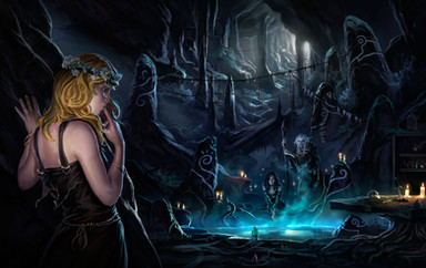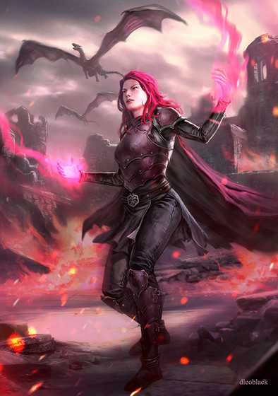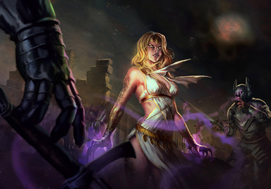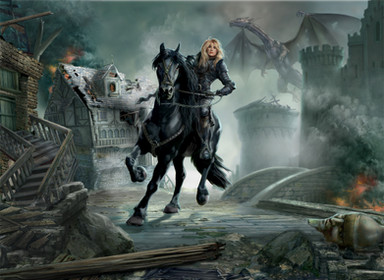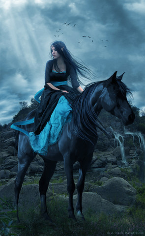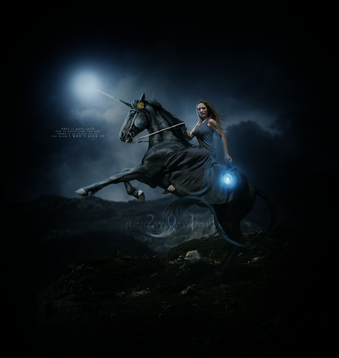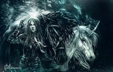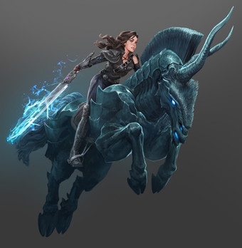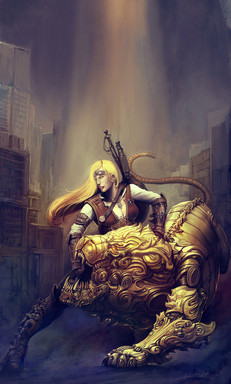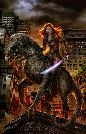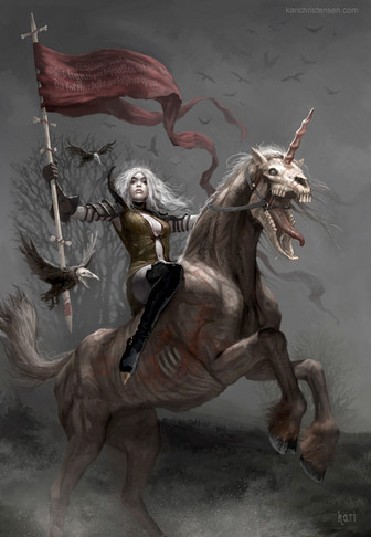 a woman riding a mutated horse through a dark city, I love it.Β Without the 'presumably' arcane light in her hands it would be even more mysterious as to how this could be?