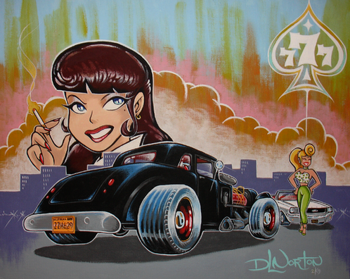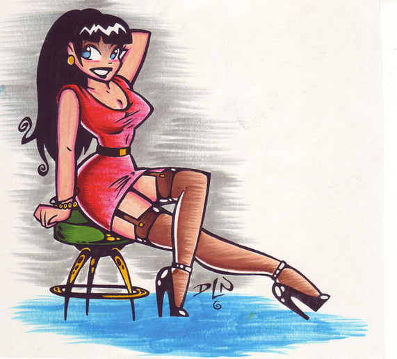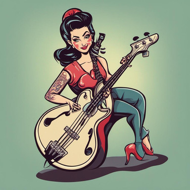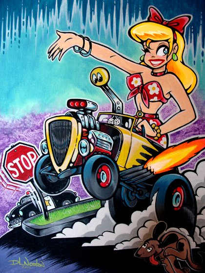 11x14 acrylic on canvas. This is a color interpretation of my original "Bass Slappin' Babe" done in ballpoint. It may look a little odd since my scanner goes only up to 8.5x14, so I had to scan the painting in two parts and then combine them in PShop and touch up here and there.Well'p..enjoy!