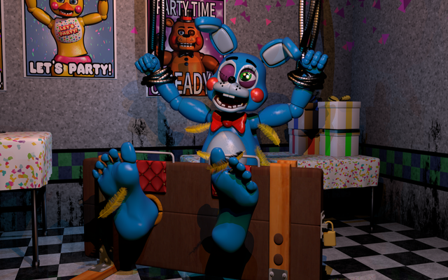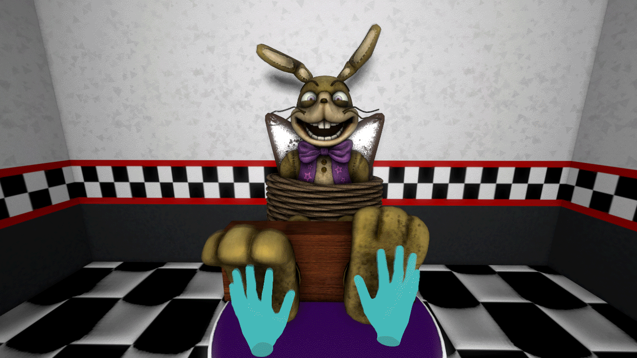 It's a moody boring day at Fazbear's Fright, everyone is down in the dumps and bored. As you sit in the office waiting on what to do, Springtrap comes in to bother you out of boredom. He begins teasing you with a few tickles, and you do the same back but Springtap is very ticklish so he bursts out with laughter right away. Hearing him laugh lightens the mood. You told him to follow you out into the hallway, and made him sit down. You then handcuff his arms and legs, and lie down to commence the fun. With him being stuck in your trap, you begin to have fun with him, and watch as the day goes from moody and boring, to fun and excitement.Credit goes to their respective owners.