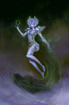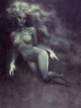 The colour pallet is nicely suited to the subject, ghostly but with a touch of colour that keeps it from getting too drab. The pose is also very good, dynamic and rhythmic, in particular her outstretched hand. The way the dress frays and dissolves is a nice touch too.