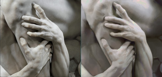 I also think the shoulder area that goes to the arm that reaches out towards us is missing some size and definition. It's the shoulder of an arm at rest at your side, not one that has muscle bunching it up for lift and force.