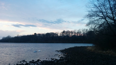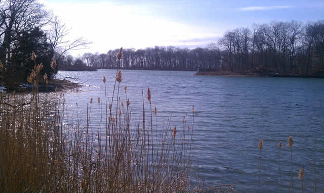 The first bend of Mystic River after it emerges from Lower Mystic Lake.