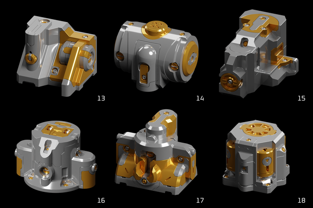 The greebles that are asymmetrical have different versions for left and right (necessary to keep the "flavor text" readable).