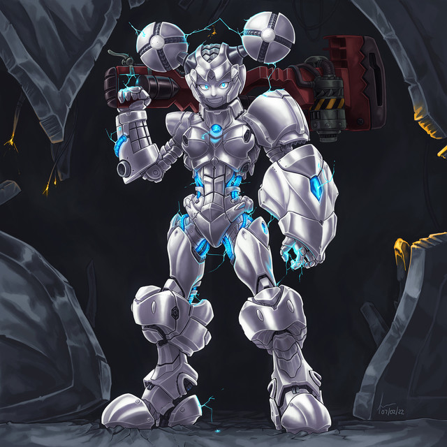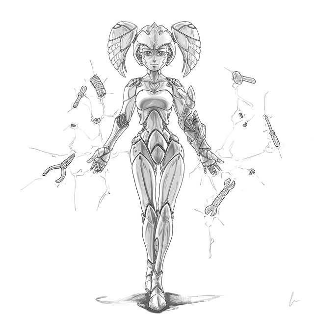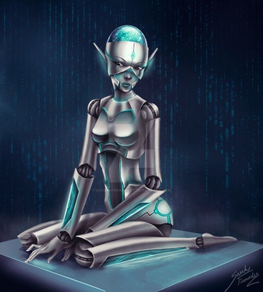 #cables #girl #holograms #lightning #lights #metal #robot #throne #ellc