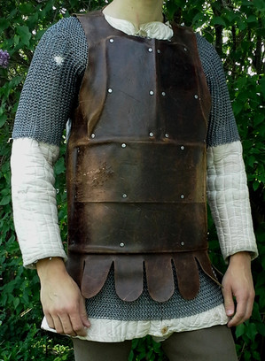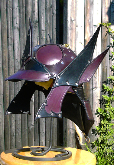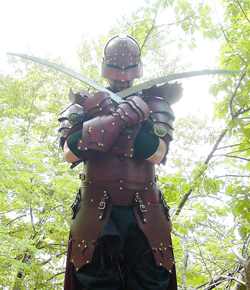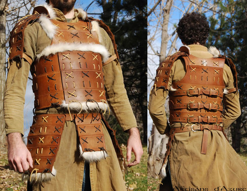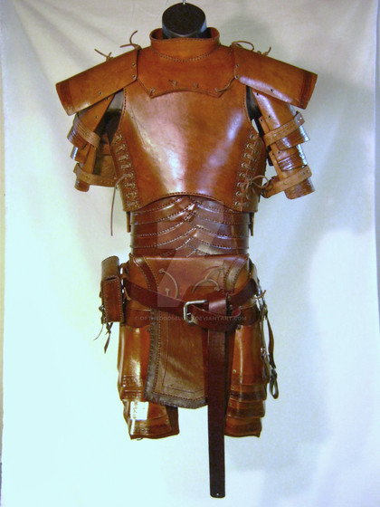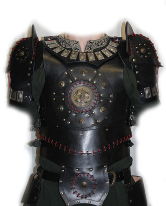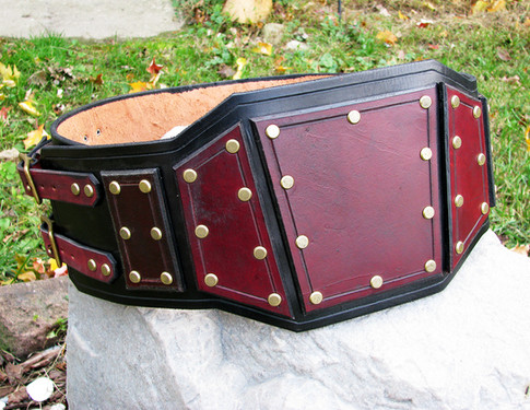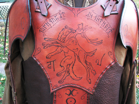 8oz bullhide base, deerskin trim, 16oz vegtan plates dyed Fiebing's Burgundy with Fiebing's Black antique... Still need to carve and rub-n-buff a bunch of runes and do the shoulders... but here's the base.Related content