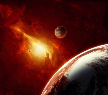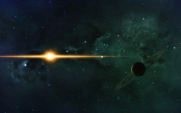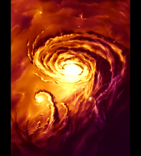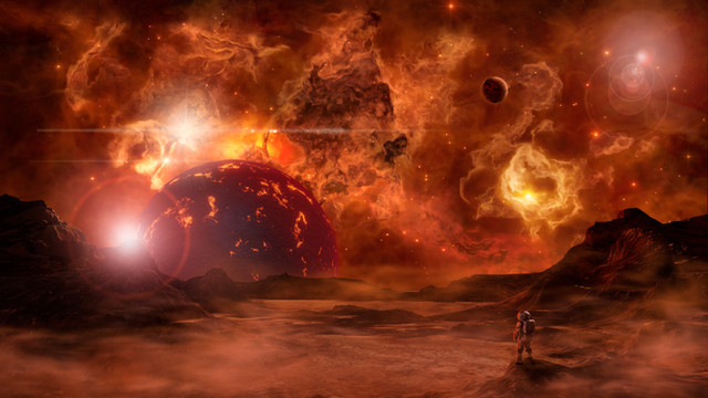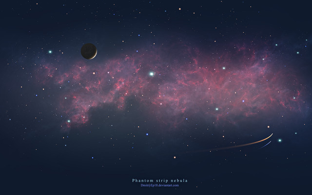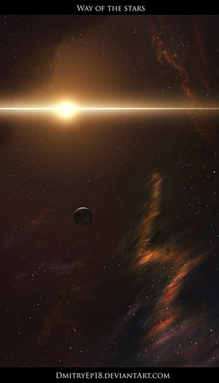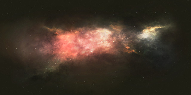 Wow! i love the amber color it has. I wonder what the gases are that would cause this color. Also, I think it is quite a nice touch, and an interesting vantage point by having the perspective be from a rocky world, or asteroid. It would be amazing to live on a world where the night sky would have an entire galaxy to light up the night. Well done!