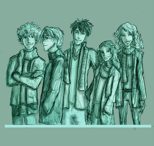 The seven special characters to match the seven books. A tribute to Deathly Hallows pt. 2. Draco, Ginny, Harry, Hermione, Ron, Luna and Neville.I wanted to make this piece of fanart have that old-picture effect. Like the ones they use in the film (although it doesn't move). Kind of like a last-day-at-Hogwarts picture.