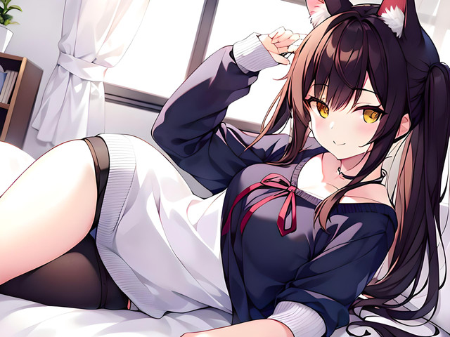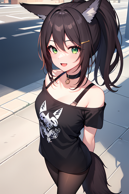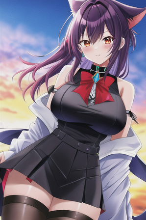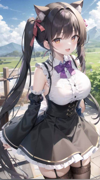 #bangs #belt #blush #breasts #choker #cleavage #collarbone #long_hair #original #shirt #skirt #solo #thighhighs #1girl #animal_ears #purple_eyes #brown_hair #looking_at_viewer #large_breasts #long_sleeves #open_mouth #bare_shoulders #white_shirt #off_shoulder #black_legwear #eyebrows_visible_through_hair #animal_ear_fluff #animedrawing #animegirl #aiart
