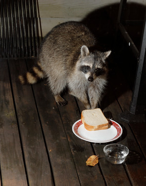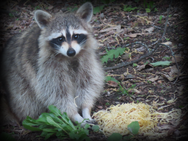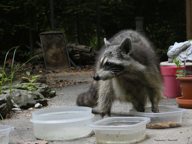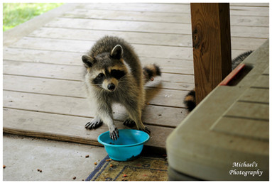 This is the same one that you can see in the latest couple of pics I have - where you see the raccoon on the back deck and on the rail. He was very emaciated after a disease decimated his family in the area. 80% of all raccoons died during the summer months and this guy was lucky enough to hang on and eat until he is now back to full weight (and attitude).
