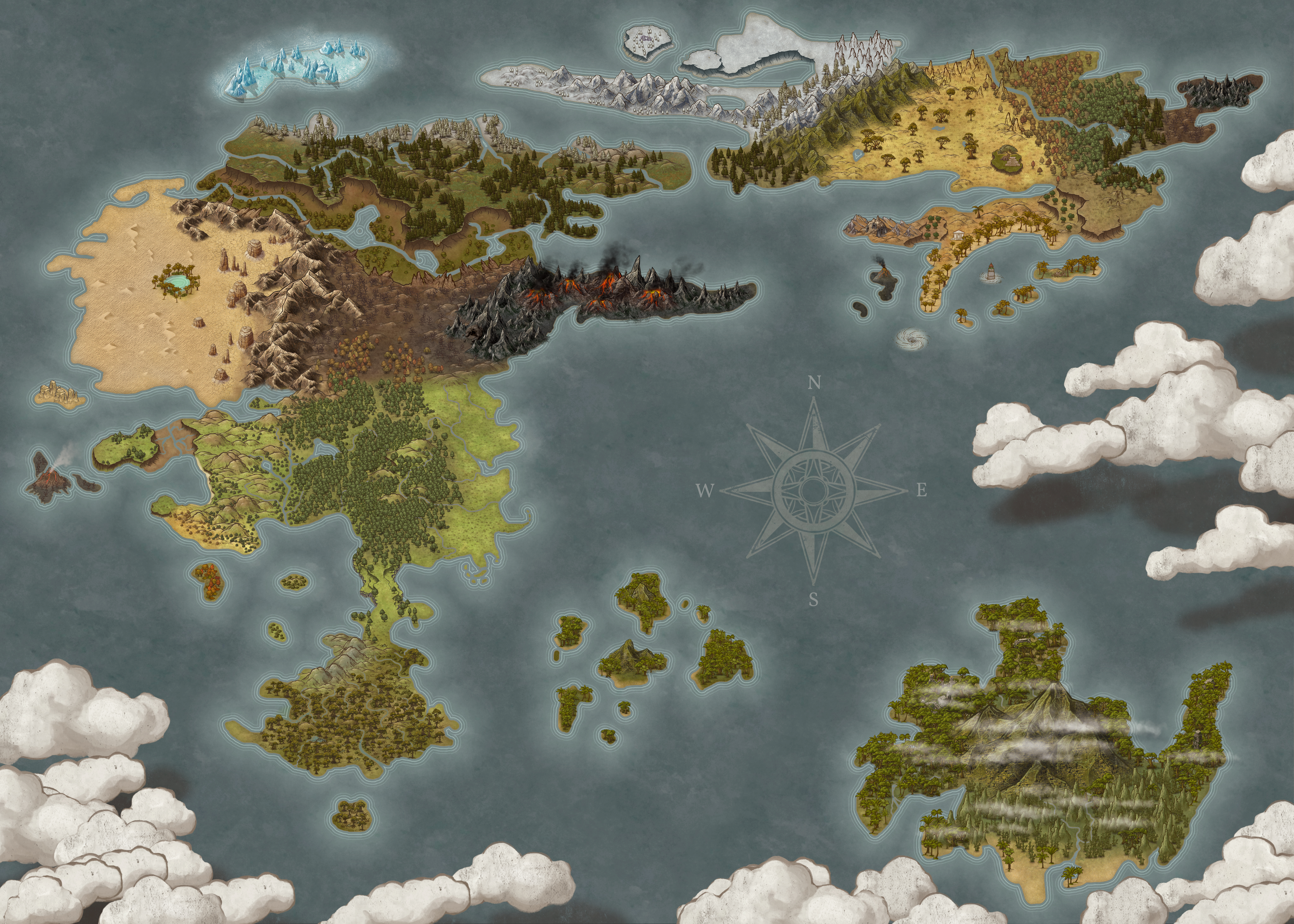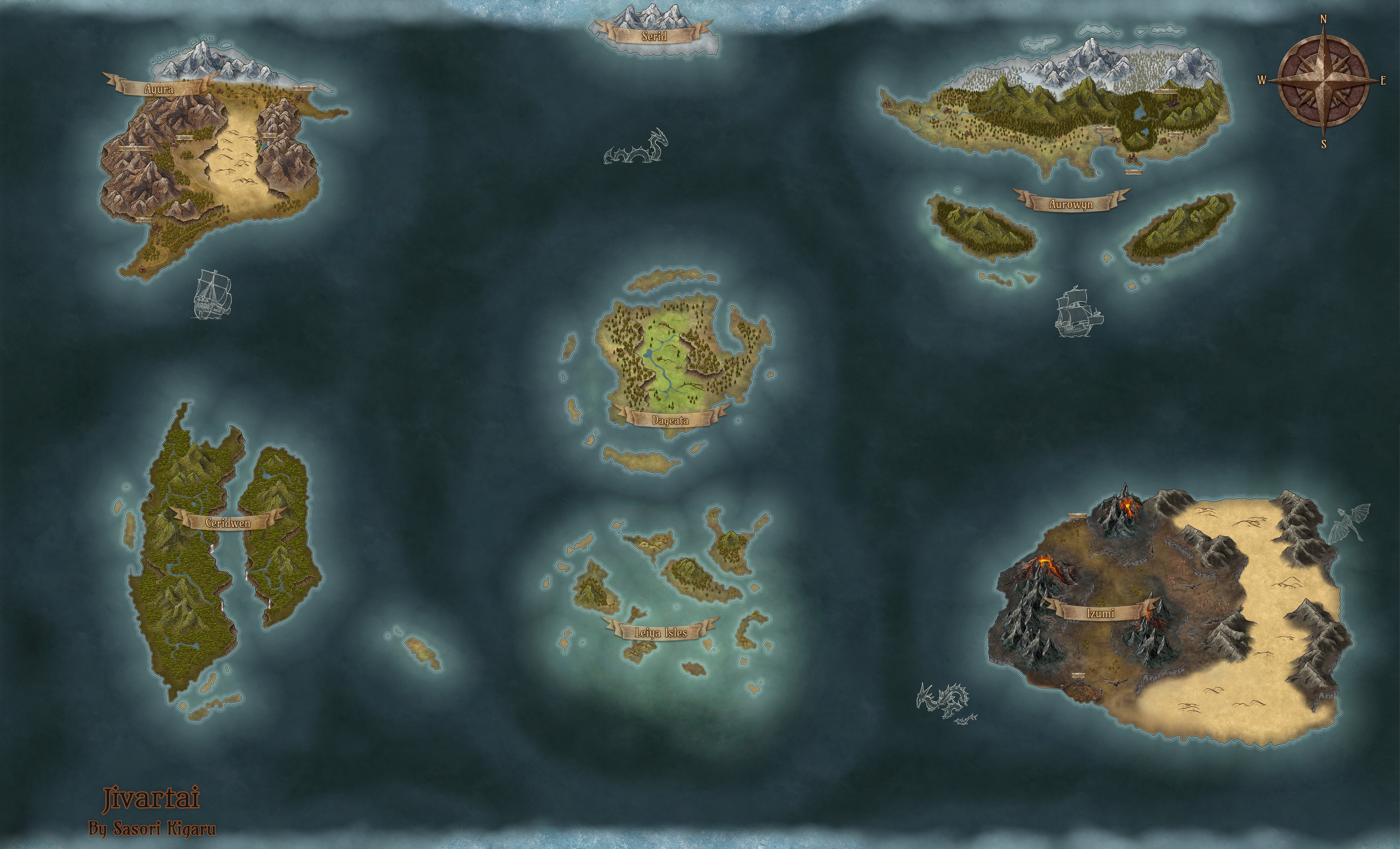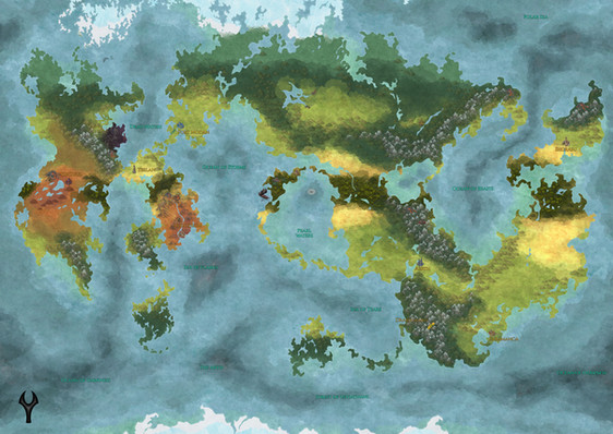 "The world of Rhea is a vast and beautiful realm, a land of lush and verdant valleys stretching between towering snow capped mountains, of long beaches of white sand bordering azure seas, and of labyrinthine caverns reach deep down into the ground below. It is a place of magic, coursing through the waters and the wind, deep within the earth, found in every home and sold in every market place.Β At its center, within the Vale of origins stands the Great Spirit Tree, planted by the goddess Rhea in ages past to keep the worldβs magic in balance and to protect it from the darkness beyond."A map of a setting I've been working on as of late, for a D&D campaign I'm planning to use as base for a Manga.