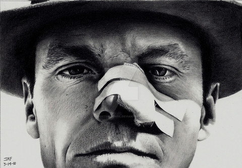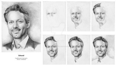 There is not any certain order that you NEED to work next. I basically go wherever I feel led. In this case, I chose to apply the FIRST layer of shading to the entire face (shown below BEFORE blending) and to darken the forehead wrinkles. The wrinkles will be accidentally lightened when I adjust the shading on the skin with a blending stump, and usually have to be re-drawn many times, so I need not bother shading both valleys on either side of each wrinkle just yet, because they will get smudged while shading the forehead. I pull out highlights with a kneaded rubber eraser last, after the whole face has been finally shaded, so you will not see that yet (More on that in a later step). His hair bangs lay across his forehead, but I will create them later using the rubber eraser, and "negative drawing" (drawing around the object, NOT the object itself).