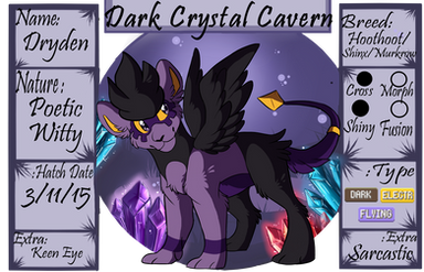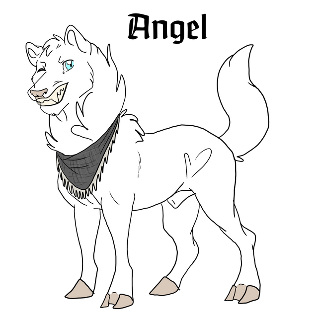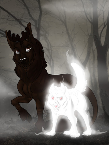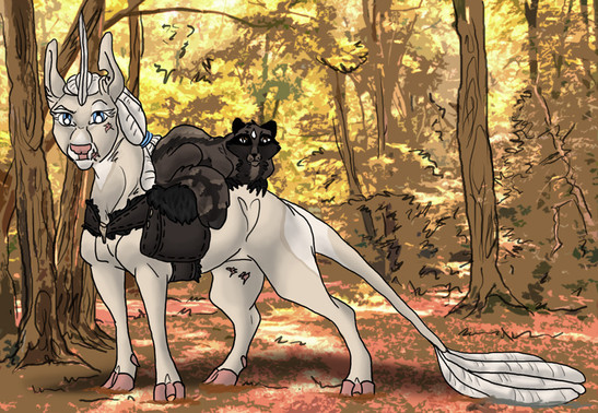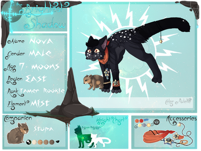Appearance: white coat with black front legs and a black ridge up to hairtuft, black markings under eyes, night-time themed midnight blue tail with moon marking, heartstone with a golden cresent moon.