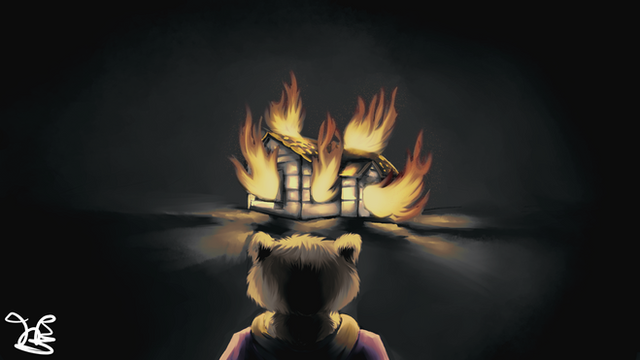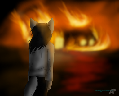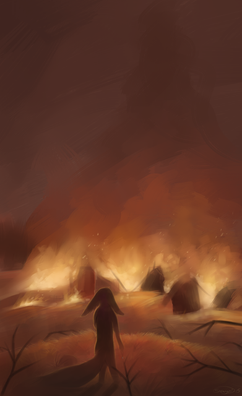 “Rin, close your eyes.” Elin instructed softly before darting ahead to lead the group. The kit tried to listen, but his eyes were locked onto the giant flaming beast that used to be their barn. A sickening cracking sounded from it, making Rin think that somehow it really had come to life, and was moving to stand up, intending to burn everything else he knew and loved to the ground. But instead it fell, roof collapsing, a massive burst of flame bursting from the gaping wound.