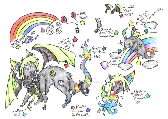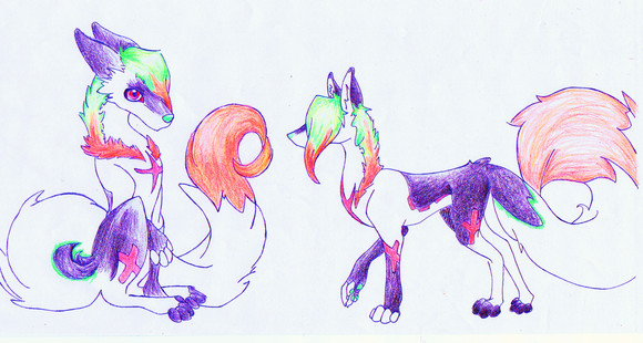 2008 - I was young and wanted "a super original fursona". She totally had a very depressing back story and was of course, covered in [so many] neon colors. She was apparently a winged [dragon] cat/wolf/fox hybrid that was mostly cat..? This is probably a result of poor anatomy, therefore not making the creature look entirely like a cat. I guess the randomness and pointlessness of the design could reflect immaturity from when I was that age. It kinda hurts your eyes if you stare at it too much lol