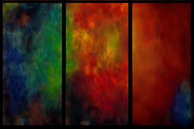 in the first panel I see a man with his left arm stretched out and half his face covered. 2nd panel I see a girl walking though a forest. the last panel i see little faces O.o