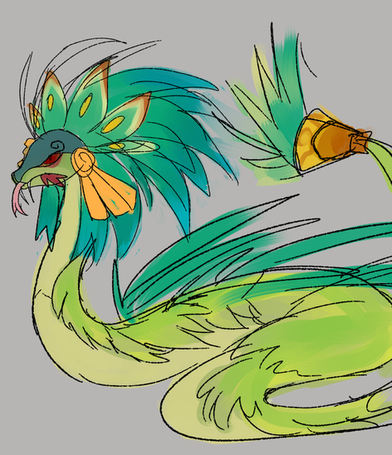 I'm pretty sure cel shading kills everything but painting just takes way too long!Anyway, here's a design for Quetzacoatl. He changed so much from my first sketch. I'll probably post those later in the week since I think they're more interesting than this.