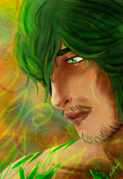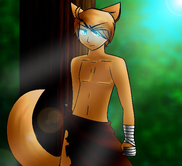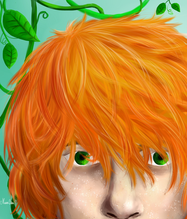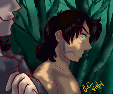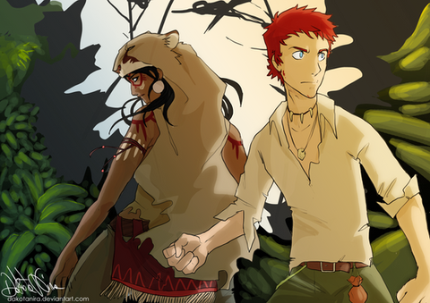 Excellent. You captured the foilage, the eagerness to hunt, and the effects of living on the island all in this one shot. His blue eyes are the best; the clash with his hair makes them more pronounced. Please do the other boys!