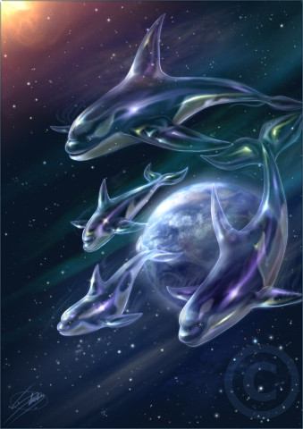 Yeah!I finally drew my fave-animal of all times again!Orcas!They`re such beautiful creatures,me loves them! ^_^ I have a weakness for these whales-ocean-universe pics,as one can see on the many posters and jigsaws hanging on my walls.The orcas were originally drawn with copic markers but then I added so many computer effects,that`s why it is in the digital art section now.Didn`t use my usual signature with the dolphin logo ยดcause it would have destroyed the picture.Simply didn`t fit in anywhere.