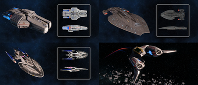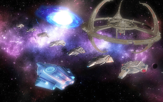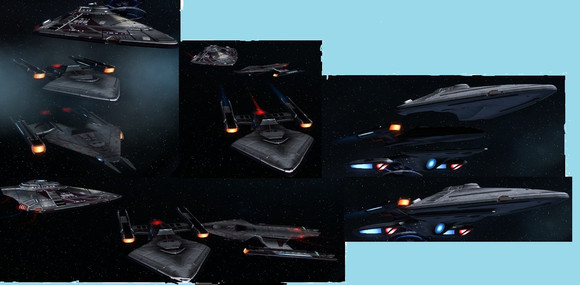 Multiple generations of Asgard mothership meet at a remote location in deep space.Original background image by Pitr.