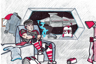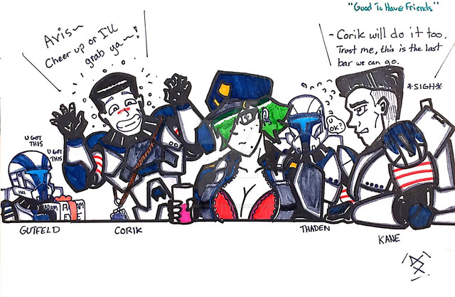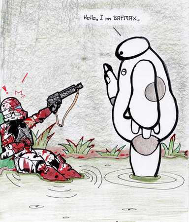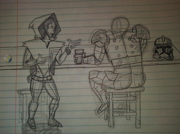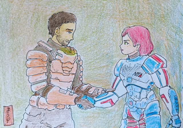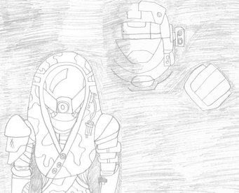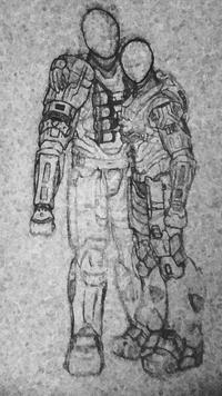 so the gravity was off then? I do like the piece a lot though, his armor looks like it's in bad shape! And before these two pieces, I've never really seen you draw a girl's face in full color, albeit behind a helmet, I like the way you drew their faces!