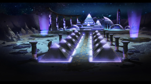 The servant Anubis do not simply float around in the Abyss, each is located at their own temple. The temples look like broken and decaying buildings, pieces of them scattered and floating. The only sign of them being occupied are the blue and purple fires that burn in braziers. The Anubis all share a similar appearances; black skin, white hair or fur, animal features, and Egyptian-like clothing.