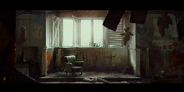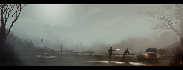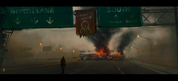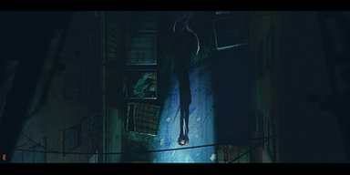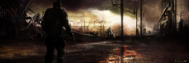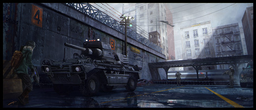 You're a master at atmosphere and landscapes! At first glance it looks like it could be a cold stormy day here in the city but the smoke or smog rising from the frame and the streets makes me think it might be humid instead. The lights coming from the bus/train/vehicle is great - especially reflecting off the wet road. Maybe the character in the forefront is heading towards it for some reason. The perspective is awesome! I'm eying that obscured structure in the back, it looks like a ship or mansion, or a giant rock formation. So brilliant as always!