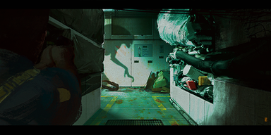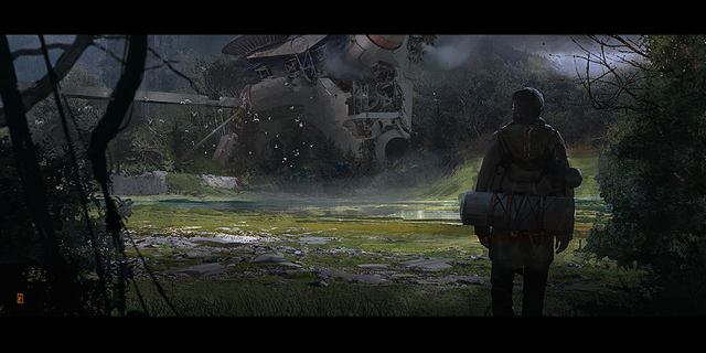 Played around with the focus more towards the city, but decided later to keep the focus on the character and the big ship in the BG!