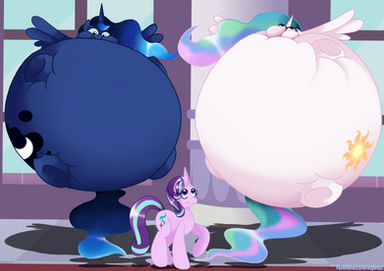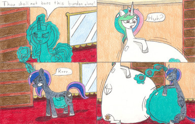 Celestia and Luna got costumes for the contest. Celestia went as Daybreak, but Luna one-upped her by going as Nightmare Moon. So Celestia, always wanting to be the best, decided to be a fart balloon. And of course, Luna wanted to be a BIGGER one!