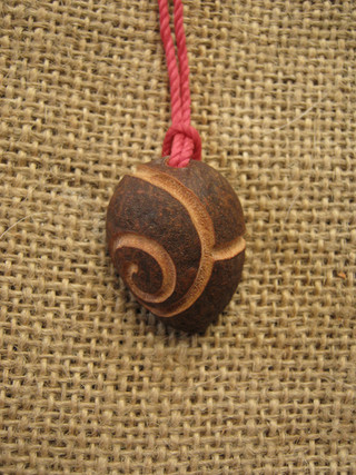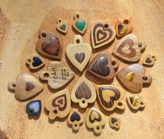Rattle in the shape of a heart with a honeycomb hole pattern, about 2-1/2 inches high, 1-1/4 inches thick.Olive wood, with a thin walnut wood back as a sounding board; 32 4mm glass balls inside; brass tube crosses interior hollow to hold cord. Handrubbed beeswax finish. Produces various sounds depending on orientation, and direction and speed of shaking. The carving shape and texturing look better in person.