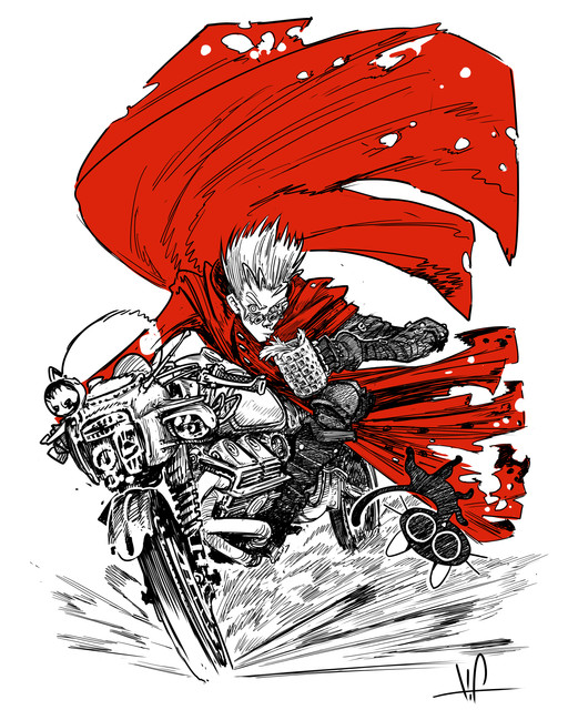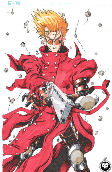 idk if people will get it, so ill explain just in case: the 1998 trigun anime album cover looks vaguely like the sonic adventure cover pose , so i drew vash doing that pose. it was supposed to just be a joke. i drew this three times. whoopsies.