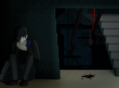 hearing footsteps, tim gets the heck out of there, leaving his impressive puddle of blood behind