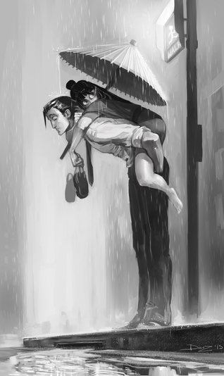 Love how you did the coloring and shading. The child looked very sweet, especially when she's playing with her doll beneath her father's cape and the father doesn't seemed to mind as he stoically continues his work.