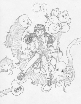 this is a fun piece! I especially like the creature trying to taste the cat that is holding on to her bag. Great imagination and work