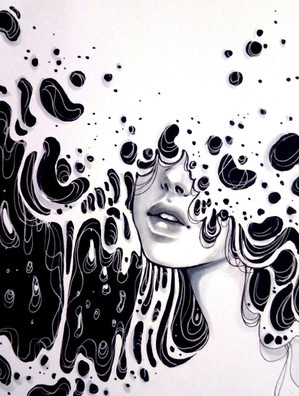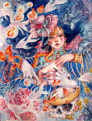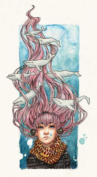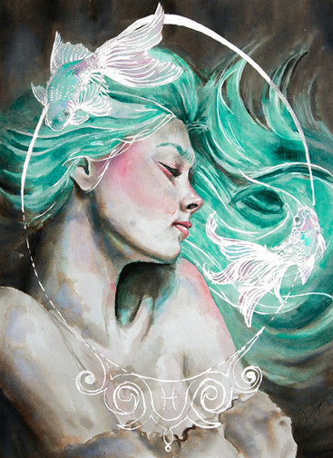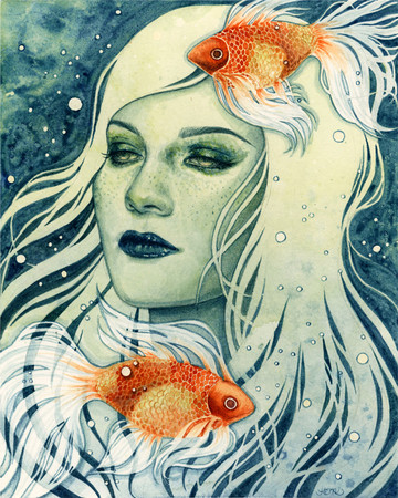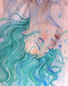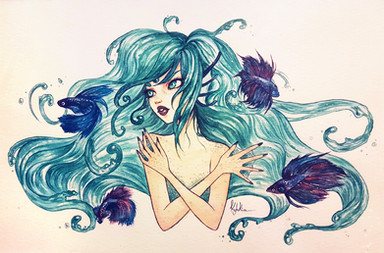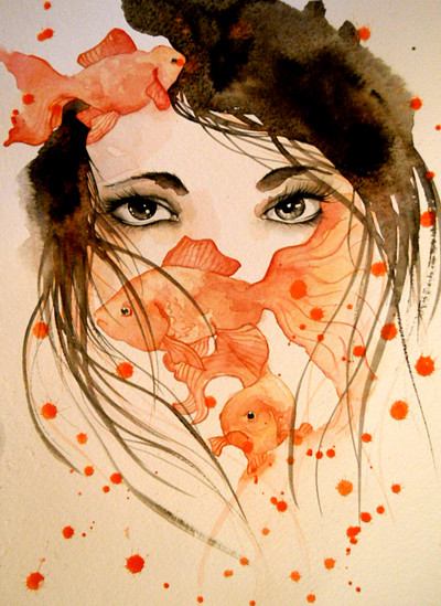 #blue #brown #steam #fish #longhair #watercolors #woman #cupcoffee #womanprofile #coffeepainting
