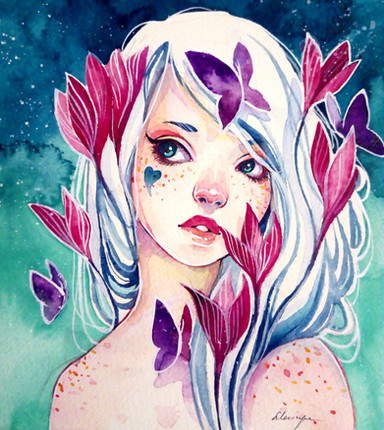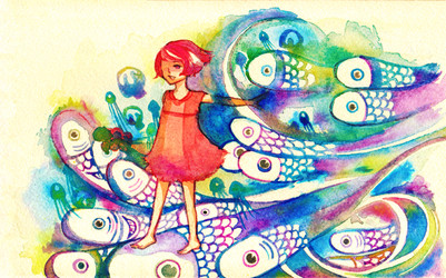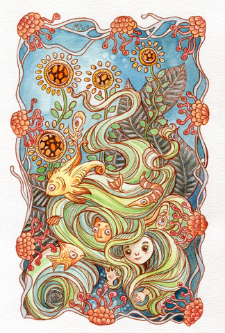 Such lively, bright colors... I also love the sense of movement, the fish flowing through her hair.