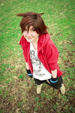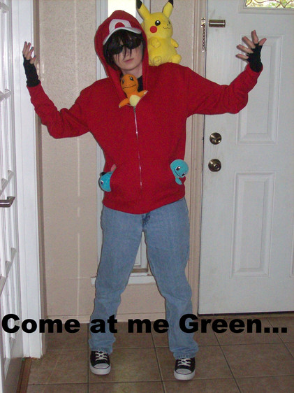 i wear a black shirt. it was a polo sweater (i guess you could call it that XD with the popped up collar and a small zipper that didnt go very far down, because it was FOR the collar. so i snipped off the sleeves, put on a black t-shirt, and put on the vest. i had bought a pokemon hat that was ash's from diamond/pearl recently before i made the vest, because it looked decently like red's hat.