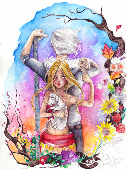 This is my entry for StressedJenny 's contest. I thought I can't even paint it. I'm so messed up with these aquarelles. But I love this comic so much. Thank youuuu Jenny. T_TI absolutely love this comic, and I'm so happy she started to share it already. I still can remember how much I've enjoyed to explore her gallery to find more and more crumbles about them. Also I felt pretty lonesome, and I think it somehow slinked in. She should see his face anyway. Ah, about faces. Jenny's special way of creating a face is some kind of mistery for me... I mean I couldn't even get close to their original features. Also Mias is a bit ooc, but I think he usually ooc when he shares these moments with her. And.. she somehow reminds me Alice. Wut? O.O Sorry for the horrible background. I tried to do my best there.