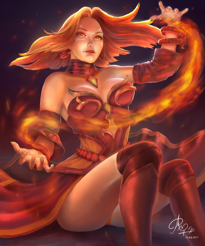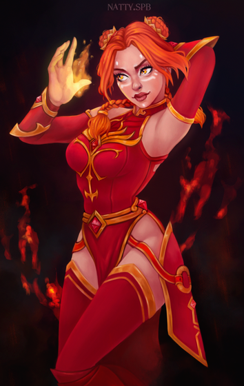 a fire mage on a sky backdrop was a great idea. she looks great, the colors contrast well and the fire is spot-on. drawing fire can be a pain.
