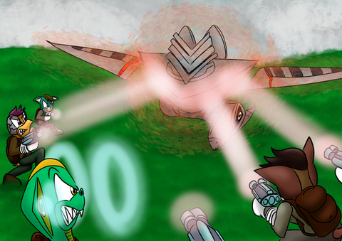 Congrats on making a full piece with several characters, a story and a setting! It's obvious you spent a lot of time on this and it shows. The attention you paid to every tiny part of this is amazing, from the expressions of the characters to all the mechanical parts. The explosion in the top left looks epic, you really did good on the fire effects. There's characters and rubble flying everywhere, you can feel the tension as they escape. Also, while I'm not in the Sonic style fandom, it's refreshing to see characters with such detailed and interesting designs. I really like the mechanical parts of them, it makes you wonder about their stories. And the attention you paid to each characters shows, not one of them looks less finished than the other. It's easy to overwork one then get lazy and don't push the others as far, but you did it! And normally I'm not one for balloon breasts, but their designs are so over the top it doesn't bother me and adds to the ridiculousness of the four of them in a ship clearly not meant for four.