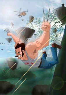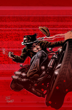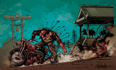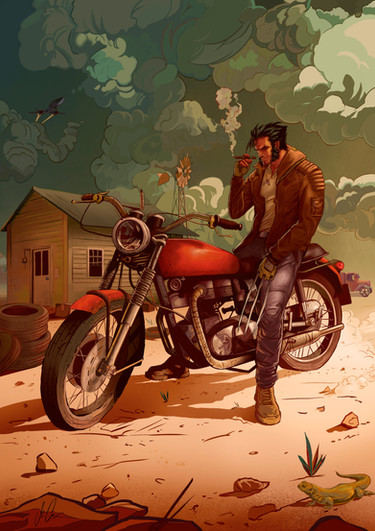 That is BADASS! Wolverine riding on a motorcycle, ready to fight off some helicopters. I love it!
