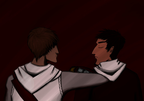 "Should I do it?" whispered Malik. He stood above Altair with his sword gripped tightly in his right arm. "I should do it! For my brother!" He slowly raises the sword with an angry expression across his face. He was ready to kill him. He wanted too, but something kept holding him back. He was about to stab him, when he noticed Altair's sleeping face. He froze in place as he watched his sleeping form. His side heaved up and down slowly as he breathed softly. Altair sighed in his sleep and he looked so...so peaceful. "Altair..." He thought. He remembers flashbacks of him and Altair. "I can't..." He whispered. He lowered the sword and dropped it to the ground. He got on his knees and felt more tears filling up in his eyes. "I just can't..." He whispered more. Altair began to slowly open his eyes and heard sniffling and crying. He looks forward and see's Malik on his knees, covering his one arm over his eyes. He sat up slowly and looked at the man with concern. He starched a bit to catch the man attention. Malik gasped as he moved his arm away from his eyes. "Altair! I didn't mean to wake you! I-I'm sorry!" He wiped the tears away from his dark eyes and stood up. Altair grabbed his arm and pulled him into a hug. It caught Malik by surprise and he asked. "Umm...Altair, what are you...doing?" Altair hugged him tighter. "What does it look like I'm doing? I'm giving my friend a good old fashioned hug to calm him down." He said with a laugh in his voice. Malik paused for a moment, before he hugged Altair back as tightly as he could. He buried his face Altair's shoulder. They stayed like that for about 6 minutes before they pulled back from each other. "Better?" Malik nodded. "Yes, I'm alright." "Good." said Altair as he laid back down on the pillow's. "G'night Malik." He said with a yawn. Malik walked towards the door and says "Night, Altair. Thanks...for everything." He slowly shuts the door and Altair has a grin spread across his face.
