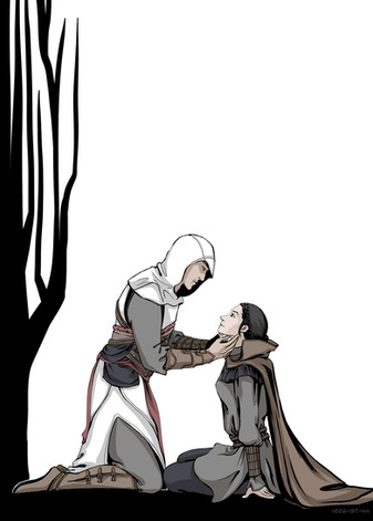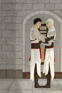 "I must do it!" Malik whisperd angrily he stood in front of Altair sword in hand. "I need to do this!" Malik Thought,he carefully raised his sword but something stopped him. He noticed Altairs face it reminding him of his own brother." I..." The more he looked at altairs face the more he felt he was his brother." I can't" Malik droped the beautifuly crafted sword and fell to his knees,shamefully looking at the ground tears flowing down on the ground. " Altair is my brother now" Malik said aloud between a couple of sobs. He stopped to feel pressure on his his shoulder he looked in front of him to see Altair, his amazed and cornered face blurred by his own tears. "A-Altair!?" Malik Exclaimed "wh-what.. I must of woke you up...I'm sorry." Malik said while wiping away his tears,he stood up about to take his leave. But before he could Altair stood in front of him. Altair started walking up to. Now they were nearly face to face . Altair grabbed Malikis right arm and pulled him into a hug, " you are right Malik we are brothers." Altair said quietly his response was a tight hug from Malik, Altair could hear his quite sobs as the older assasins head rested on his shoulder. Altair Gently rubbed his back trying to calm him down. They stayed like this for awhile until Malik broke the hug " are you ok now malik?" " I'm fine now." Malik said with a thankfull tone. " look how late it is!" The younger assasin said with a laugh. " its only 6 pm Altair!" Malik chukkeld. " anyways you should get some rest altair. You look like hell" ( Altair got a fight with some Templars. And .. Let's just say It didn't end very well for the both of them..) " fine" Altair said with a yawn he sat down on the cushions and he was out like a light. Malik only laughed and made his way out " good night..... Little brother."