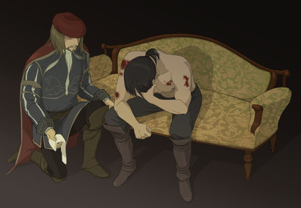 He watched, for a while. He watched Altair's fingers twitch in his restless sleep, his voice; distant, just out of hearing, calling for something. Dreams could be horrible things. Malik's fingers tightened around the blade, but he couldn't move. Finally, after realizing he had wasted so much time staring at Altair, he gave up and walked away.