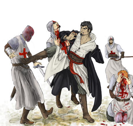Altaïr's slight fear increased to something like panic when he noticed the small river of blood starting to run by him.